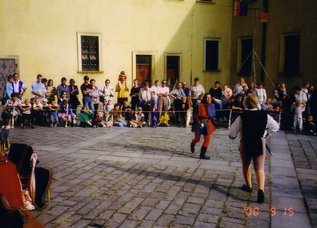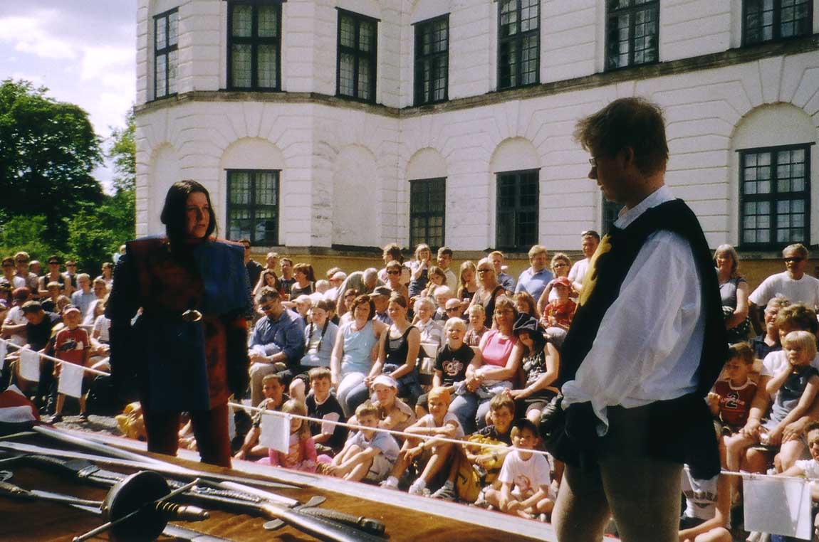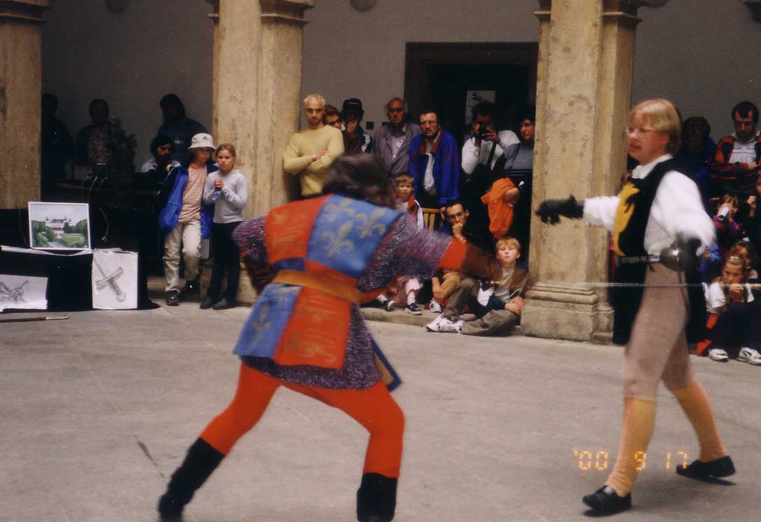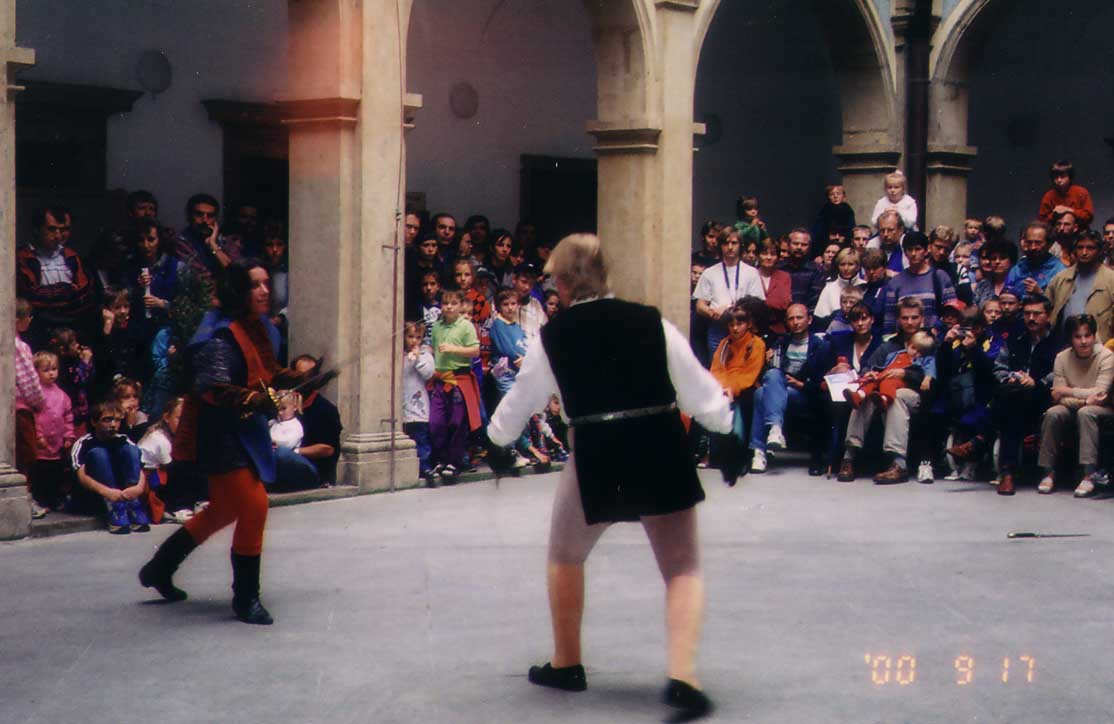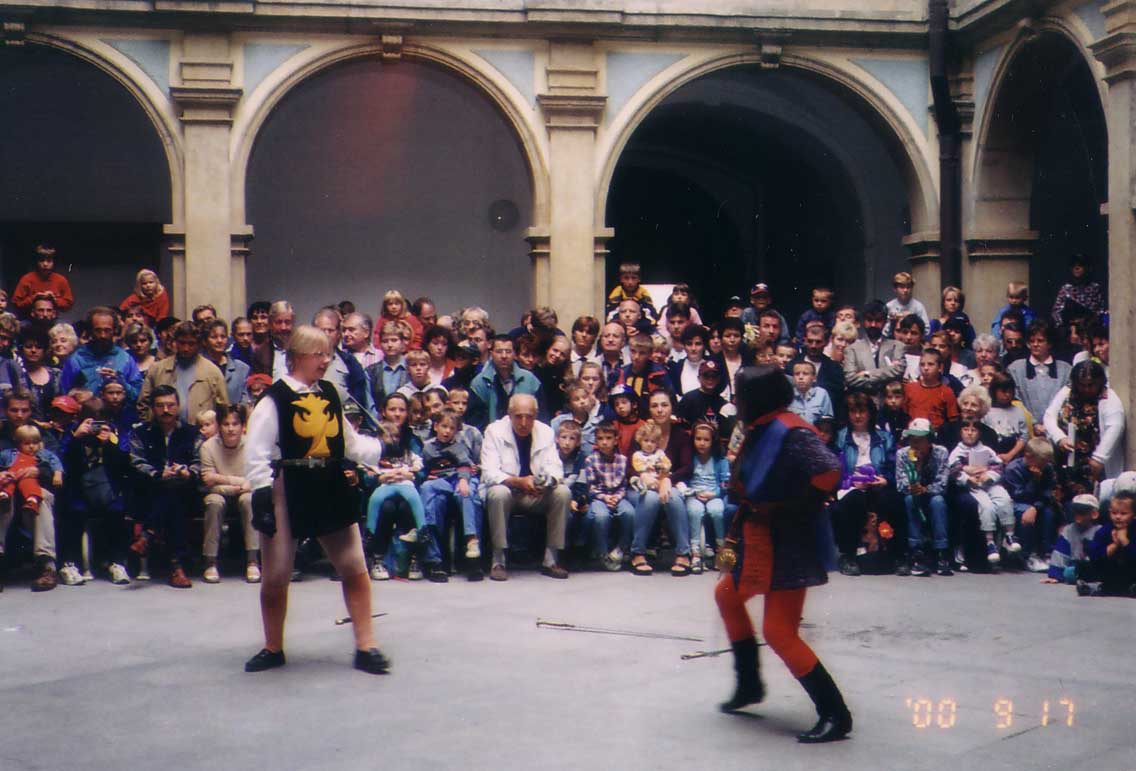 dvě představení šermu na dvou nádvořích zámku a jedna prezentace šermu na scéně